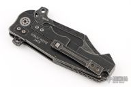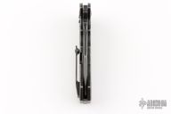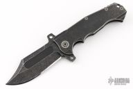 This ADV Badlands framelock flipper has a black stonewashed blade with swedge, fullers, notched thumbrest and flipper. Handle has a black stonewashed titanium frame, titanium backspacer and tip up clip with roller, matte finished hardware. Rides on bearings, nice smooth action, detent, lockup and blade seating. Has been resharpened, otherwise excellent condition.