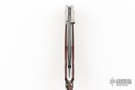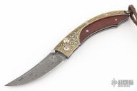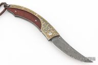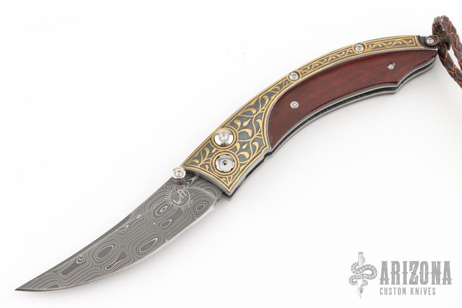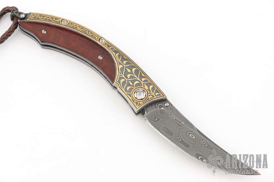The B11 Persian from William Henry features a Devin Thomas upswept Typhoon Damascus blade with single thumbstud displaying a beautiful white topaz inset. There is a white topaz inset on the button lock. The handle is comprised of Koftgari inlaid 24K gold in a blued tool steel frame and snakewood scales. Includes leather sheath with pocket clip and original box and letter of authenticity. Excellent condition. 1011-0248 08/50 5/31/2011