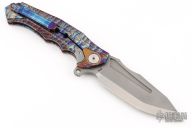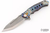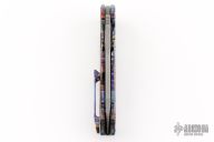 This ADV Ronin integral framelock flipper has a two-tone tanto blade with notched flipper and thumbrest. Handle has an anodized titanium frame, anodized titanium pivot collars, tip up anodized titanium clip. Has stainless steel lockbar insert and lockbar stabilizer. Nice smooth action, detent, lockup and blade seating. Comes with a nylon zippered case. Excellent condition.