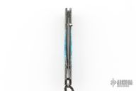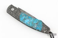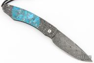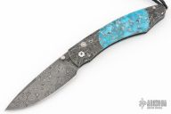 This B12 by William Henry Fine Knives features a Mike Norris Raindrop Damascus blade with a single thumbstud with white sapphire inset in a gold bezel. The handle has a Delbert Ealy T-Rex Damascus frame with 'Zinc Matrix' turquoise scales, sterling silver lanyard bail with black leather lanyard and sterling silver beads. Nice lockup and blade seating. Comes with original box, leather sheath, and COA. Excellent condition. 1612-0553 16/25 7/18/2016