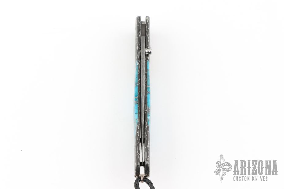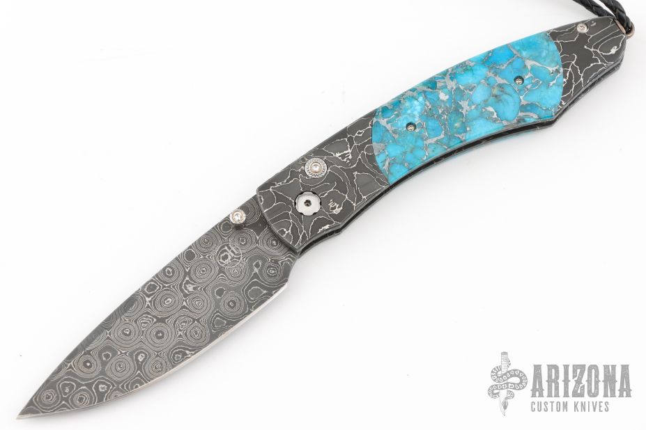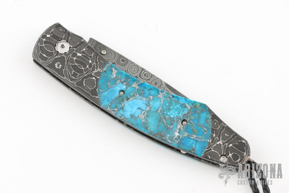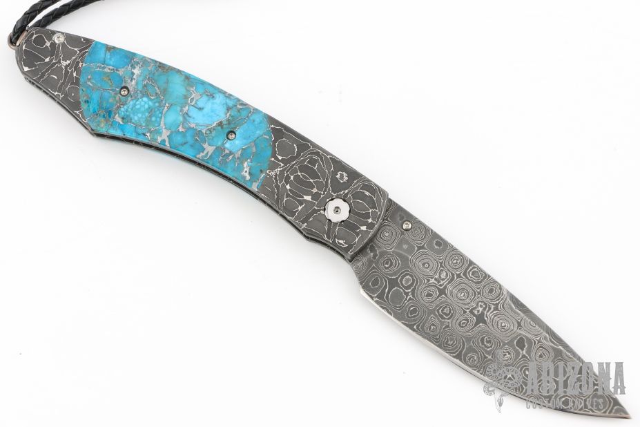 This B12 by William Henry Fine Knives features a Mike Norris Raindrop Damascus blade with a single thumbstud with white sapphire inset in a gold bezel. The handle has a Delbert Ealy T-Rex Damascus frame with 'Zinc Matrix' turquoise scales, sterling silver lanyard bail with black leather lanyard and sterling silver beads. Nice lockup and blade seating. Comes with original box, leather sheath, and COA. Excellent condition. 1612-0553 16/25 7/18/2016