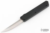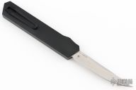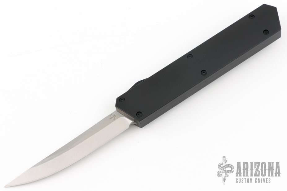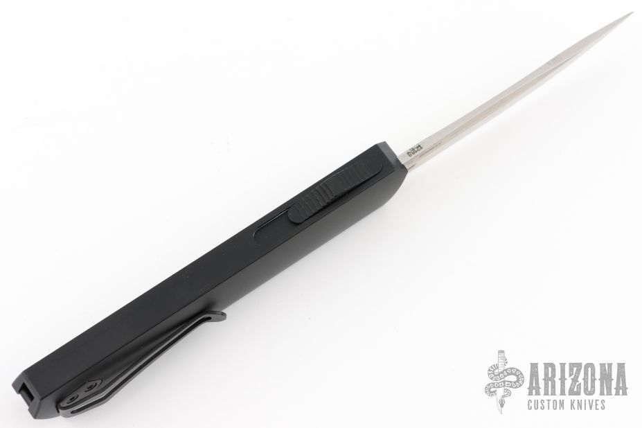 The Boker Plus Kwaiken OTF combines the slim, minimalistic design with a perfect automatic mechanism. When the serrated trigger on the top of the handle is pushed forward, the satin-finished blade made of D2 jumps out of the milled aluminium handle frontally at breathtaking speed and disappears again in the same way when the trigger is pulled. The clip (tip-up/r) forms a successful contrast to the black handle. With lanyard hole. Comes with original box, zippered case and papers. New condition.