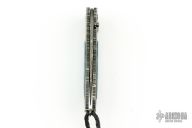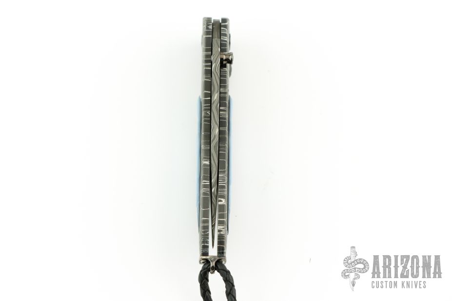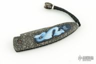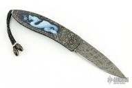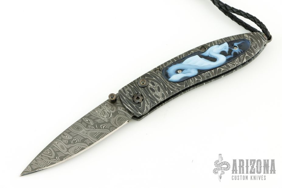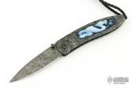 This Monarch by William Henry features a Mike Norris Hornets Nest Damascus blade with single thumbstud with a spinel gemstone, matching button lock. The handle has a Chad Nichols River Rock frame with hand carved banded agate inlays. Comes with original box, sheath and COA. Excellent condition. 175-0889 08/50 9/26/17