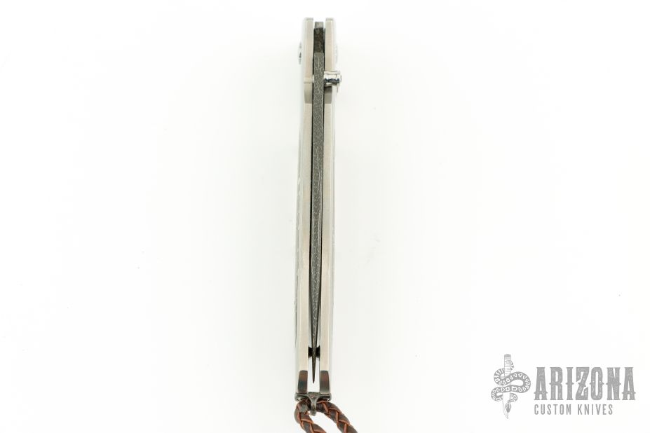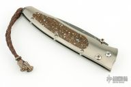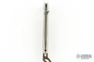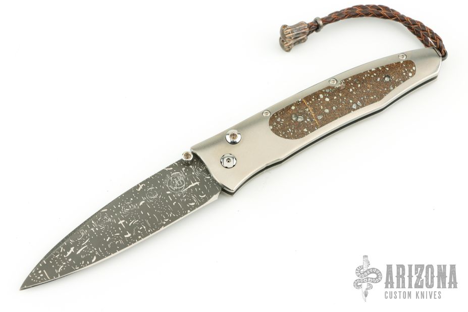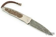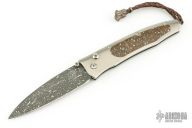 This B30 by William Henry features a Rob Thomas Damascus blade with single thumbstud. The thumbstud and button have smoky quartz stones set in 18K gold bezels. The handle has a blasted titanium frame with copper firebrick (salvaged from a historic kiln in Michigan) inlays. Comes with original box, sheath, and COA. Excellent condition. 1030-0933 08/50 1/18/2011