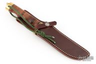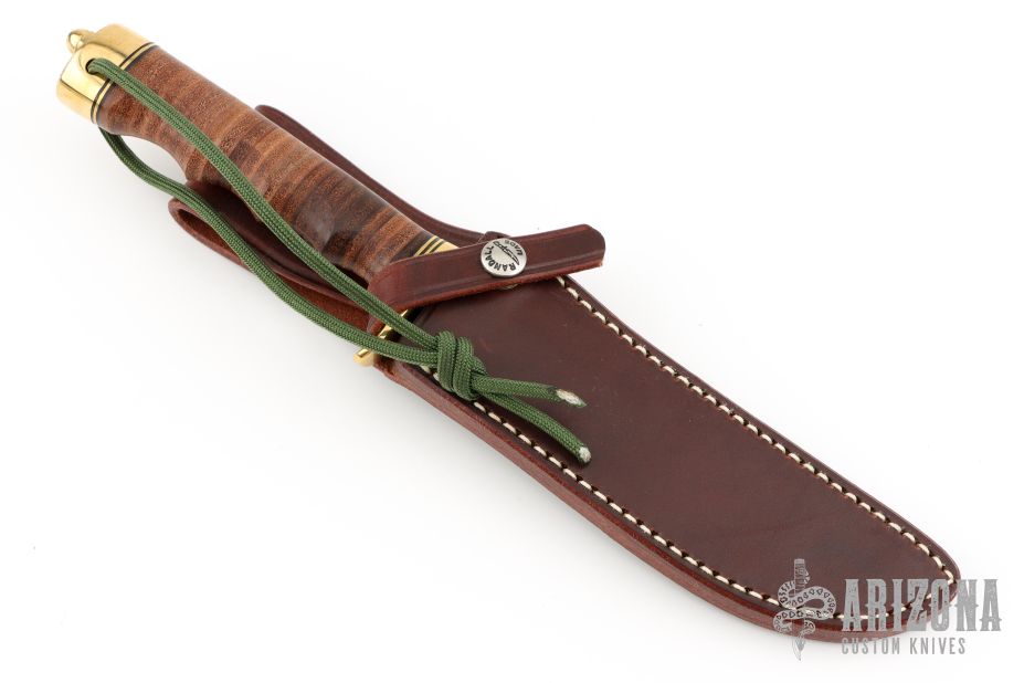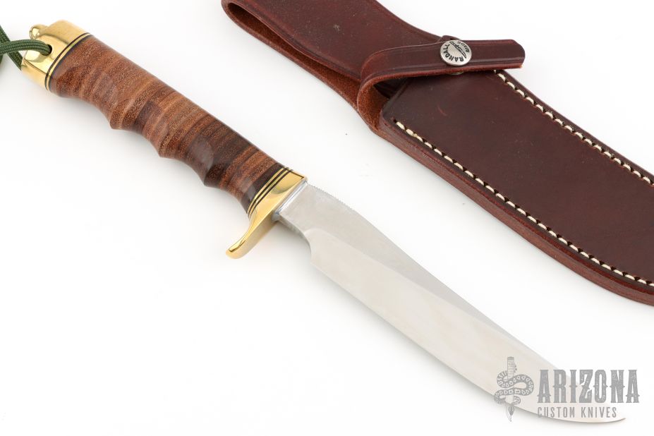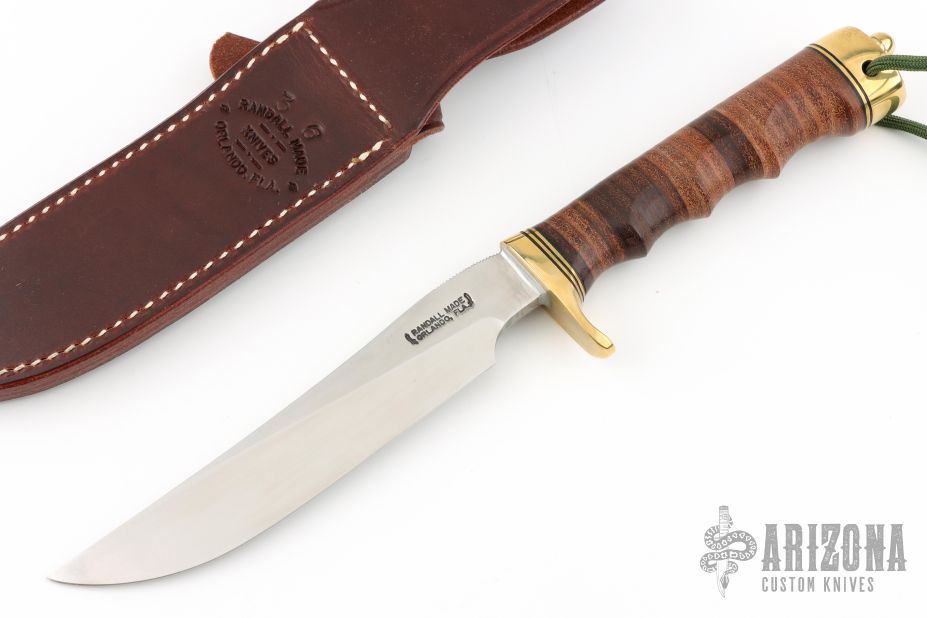 This Model 3-6 by Randall Made Knives features a satin finished blade with notched thumbrest, .195" blade stock and 1.140" blade depth, hidden tang construction. The handle has a brass guard, finger groove stacked leather grip with black/brass spacers, brass butt. Comes with a brown leather sheath. New from maker.