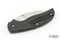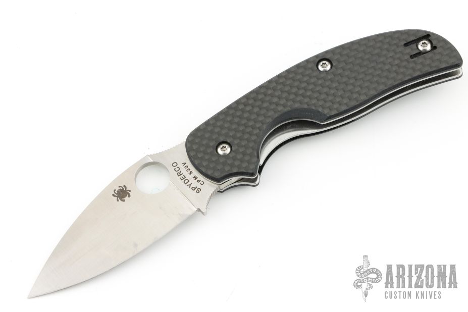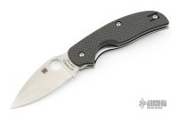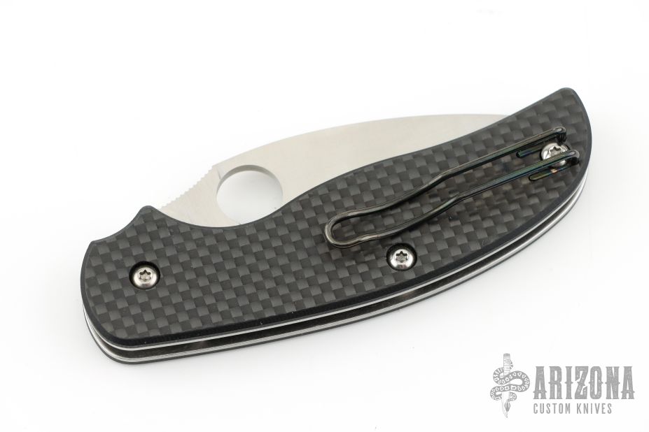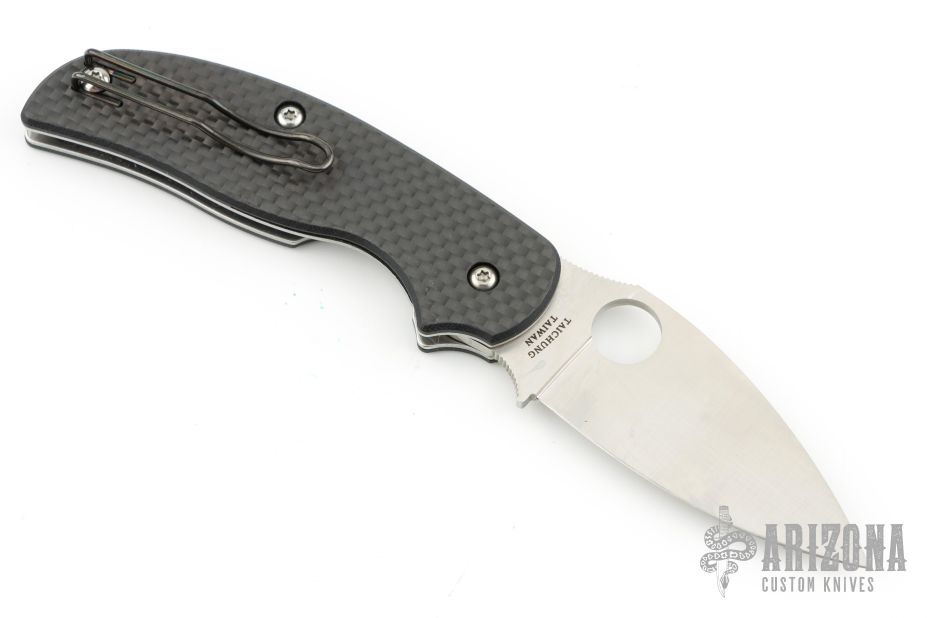 This Sage by Spyderco Knives features a satin finished blade with thumb hole. Carbon fiber pattern G-10 scales, stainless steel liners. Has scuffs and scratches throughout, good condition otherwise.