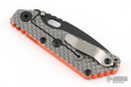 This SNG GG by Strider has a black spear point blade with dual thumb studs, thumbhole, and notched thumb rest. Handle is orange G10 and titanium frame, with lockbar stabilizer and a matching tip up clip. Nice detent, lockup and blade seating. New condition.