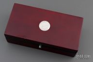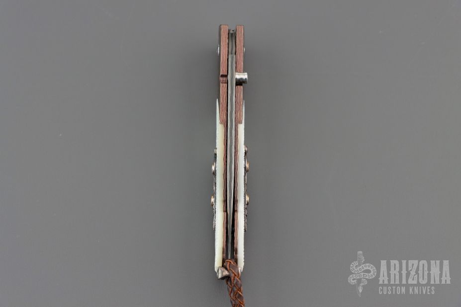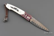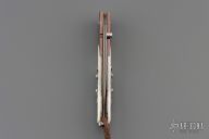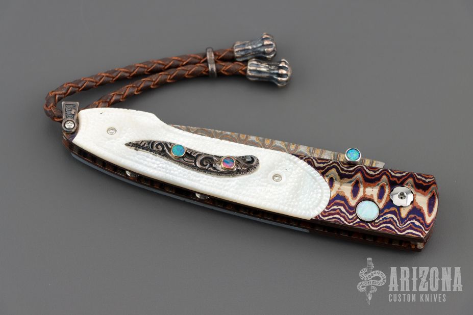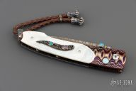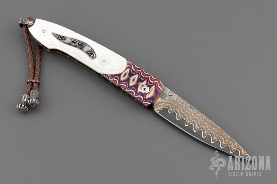 This B10 by William Henry features a 'Copper Wave' Damascus w/ VG5 Core blade. Very nice heat blued wave mokume game frame with scales that are carved mother of pearl with sterling silver and inset opals. The stone inlays on thumbstud and button lock are Opal. Comes with original box, sheath and COA. 810-0695 013/100 6/18/2008