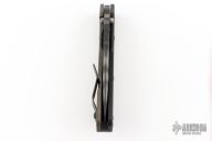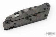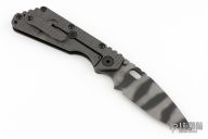 This SMF from Strider Knives features a tiger stripe blade and textured black G-10 and flamed titanium handle and matching tip up titanium clip. Notches on thumbrest, rear of handle, and lockup. Includes Hinderer "Lock Bar Stabilizer" for maximum reverse lock retention. New condition.