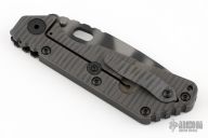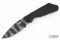 This SMF from Strider Knives features a tiger stripe blade and textured black G-10 and flamed titanium handle and matching tip up titanium clip. Notches on thumbrest, rear of handle, and lockup. Includes Hinderer "Lock Bar Stabilizer" for maximum reverse lock retention. New condition.
