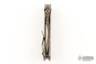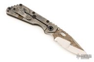 This SMF by Mick Strider features a nightmare ground partially serrated blade with a notched thumbrest and thumbhole and magma textured flats. The handle has a flamed titanium frame with Batwing logo, matching tip up clip. New condition.