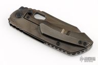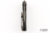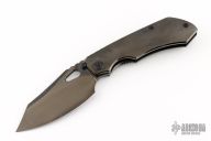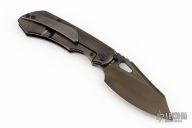 This Evolution 3.0 by Custom Knife Factory features a black satin finished blade with notched thumbrest and thumbhole. The handle has a black bark finished titanium frame with a matching tip up clip and backspacer. Comes with velcro case and COA. Nice detent, lockup and blade seating. #367 and dated 8-22. New condition.