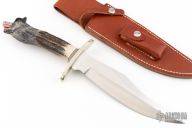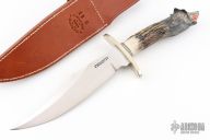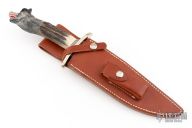 This Model 12-8 Bear Bowie from Randall Made Knives features a satin finished stainless steel blade with a sharpened top edge, .234" blade stock and 1.680" blade depth, hidden tang construction. The handle has a forward curved nickel silver guard, crown stag grip with black/duralumin spacers. The butt of the grip has been carved with a "Timber Wolf" with ruby eyes by Paul G Gussenmeyer. Comes with original brown leather sheath and a Randall zippered case. Excellent condition. Made in 1993