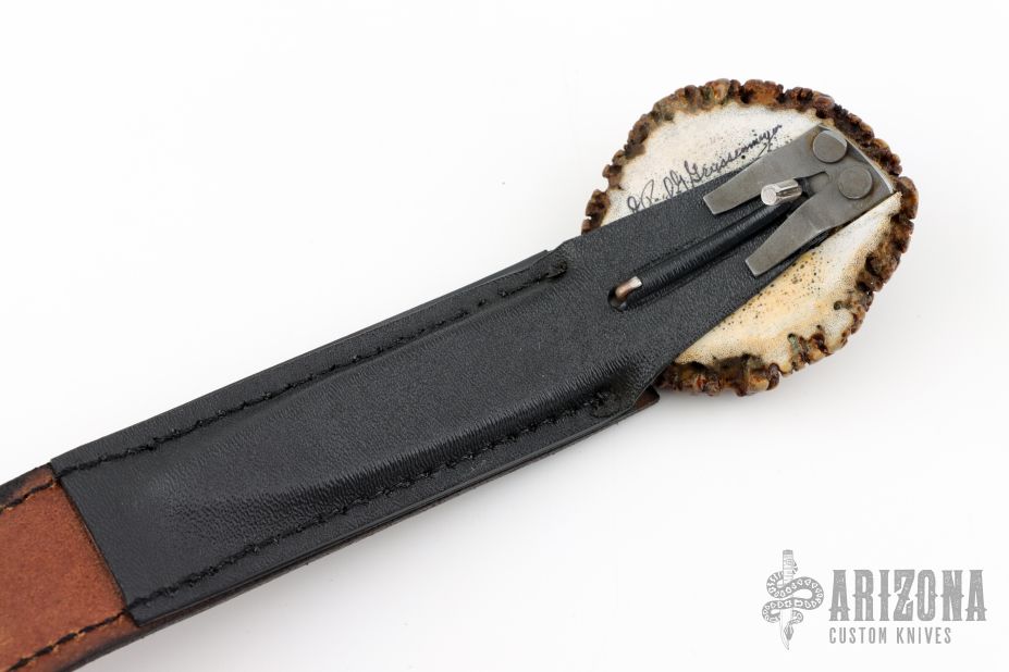 Brown Leather belt with buckle knife by Daniel Valois. Blade slides into concealed leather sheath with button clasp and is curved to follow the contour of the waist. The handle is crown stag that has been carved by Paul G Grusenmeyer with an image of a timberwolf. Excellent condition. 41” belt, belt is good up to 36"-38" waist. 1.5" tall and is a little worn.