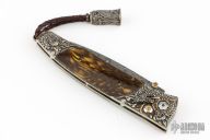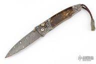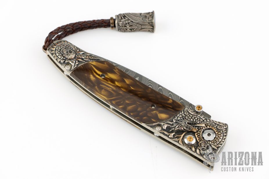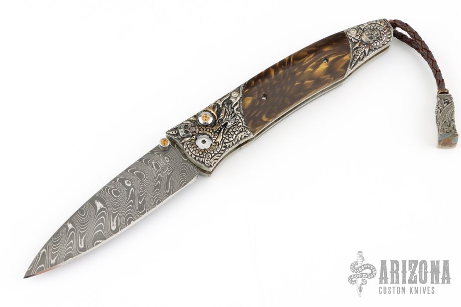 This B30 by William Henry features a Chad Nichols Boomerang Damascus blade with single thumbstud, citrine inset with 18K gold bezel, matching stone in button. The handle has a carved sterling silver over a nickel silver frame, 'dragon scale' composite scales and stainless standoffs. Includes original box and certificate of authenticity. Excellent condition. 1530-1173 3/21/2016