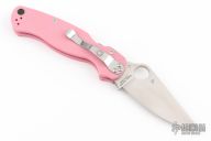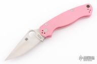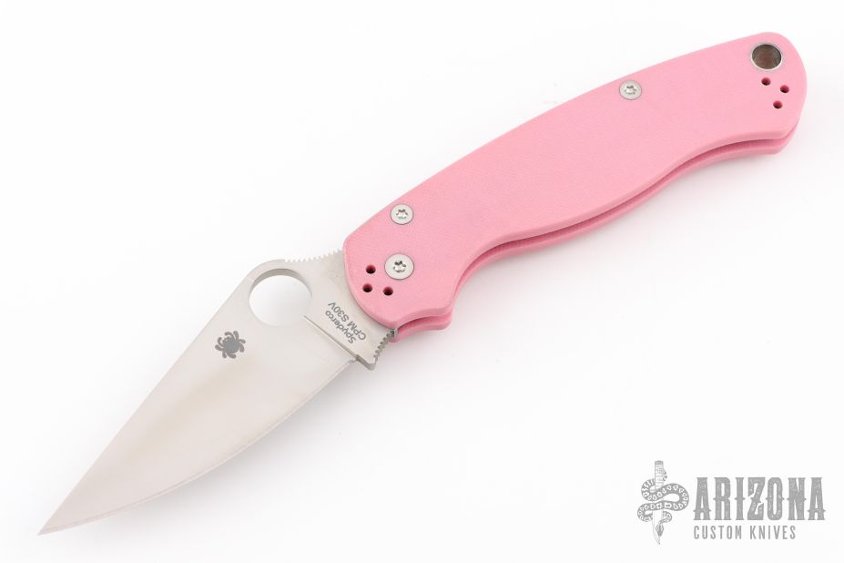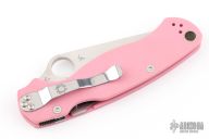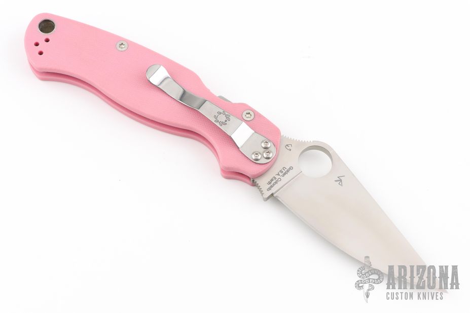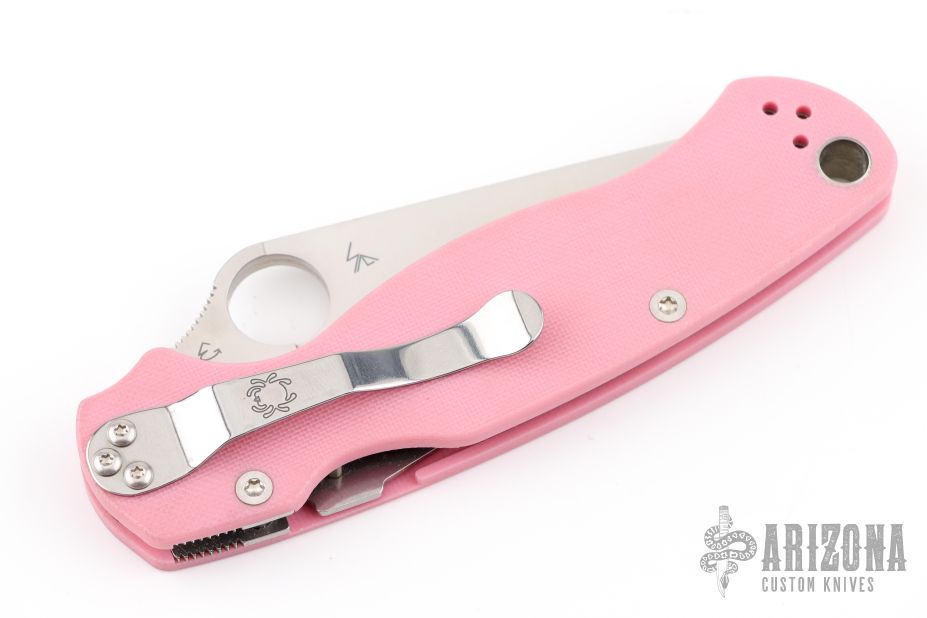 This Paramilitary 2 Linerlock Folder from Spyderco has a satin finished clip point blade with thumb hole and notched thumb rest. Handle is pink G10 with stainless steel liners and stainless steel 4-way reversible clip. Comes with original box and papers. Excellent condition.