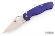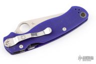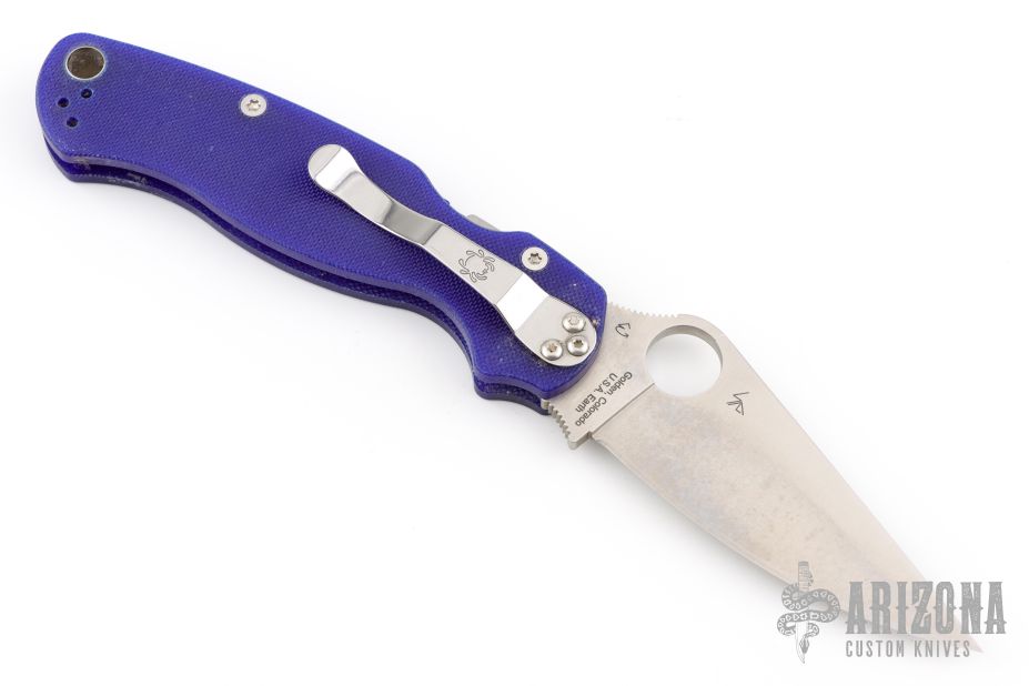 This Paramilitary 2 from Spyderco has a satin finished clip point blade with thumbhole and notched thumb rest. Handle is blue G10 with stainless steel liners and stainless steel 4-way reversible clip. Comes with original box and papers. Excellent Condition.