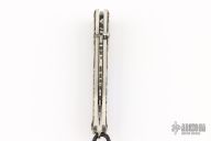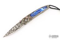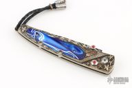 This B30 by William Henry features a carbon steel Damascus blade with single thumbstud, ruby inset with 18K gold bezel, matching stone in button. The handle has carved sterling silver over a nickel silver frame, Kirinite acrylic scales and stainless standoffs. Includes original box and certificate of authenticity. Excellent condition. 1510-228 9/21/2015