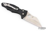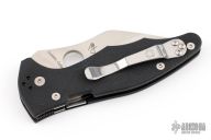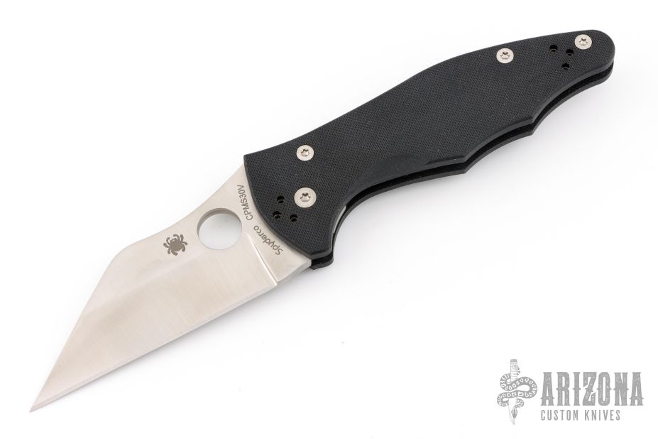 This Yojimbo 2 by Spyderco features a satin finished wharncliffe blade with thumbhole. The handle has a black G-10 frame with stainless steel liners, lock is on the spine of handle. 4-way reversible clip. Nice detent, lockup and blade seating. Excellent conidtion. Comes with original box and papers.