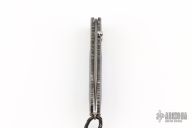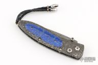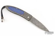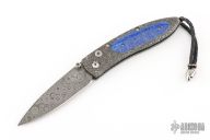 This B05 by William Henry Fine Knives features a Mike Norris Raindrop Damascus blade with a single thumbstud with sapphire inset in a gold bezel. The handle has a Chad Nichols River Rock Damascus frame with lapis lazuli scales, sterling silver lanyard bail with black leather lanyard and sterling silver beads. Nice lockup and blade seating. Comes with original box, leather sheath, and COA. Excellent condition. 175-0375 32/50 4/6/2017