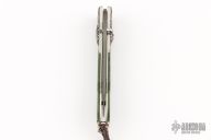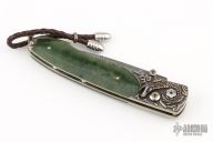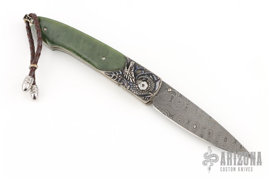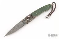This B10 by William Henry features a Chad Nichols Jet Stream blade. Very nice carved sterling silver frame with green jade inlays. The gemstone inlays on thumbstud and button lock are smoky quartz Comes with original box, sheath and COA. 1610-0015 33/50 11/8/2016