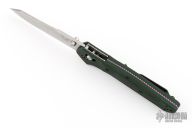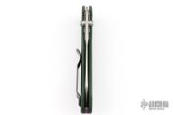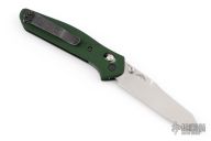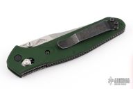 This Benchmade Osborne 940 features a tumble finished clip point blade with swedge and dual thumb studs. The handle is comprised of a machined and green anodized aluminum frame over jimped and purple anodized titanium backspacer. The black coated, steel tip up clip is reversible for right or left hand carry. Excellent condition. Comes with original box and papers.