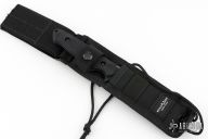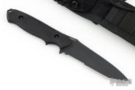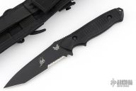 This Nimravus by Benchmade has a black tanto blade with partially serrated edge, 1/8" blade stock and 1 1/8" blade depth, full tang construction with black aluminum scales and lanyard hole. Nylon tactical belt sheath. Allen Elishewitz design. Excellent condition. Comes with original box, sheath and papers.