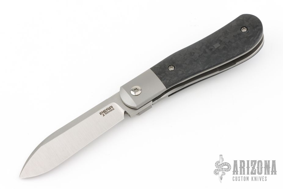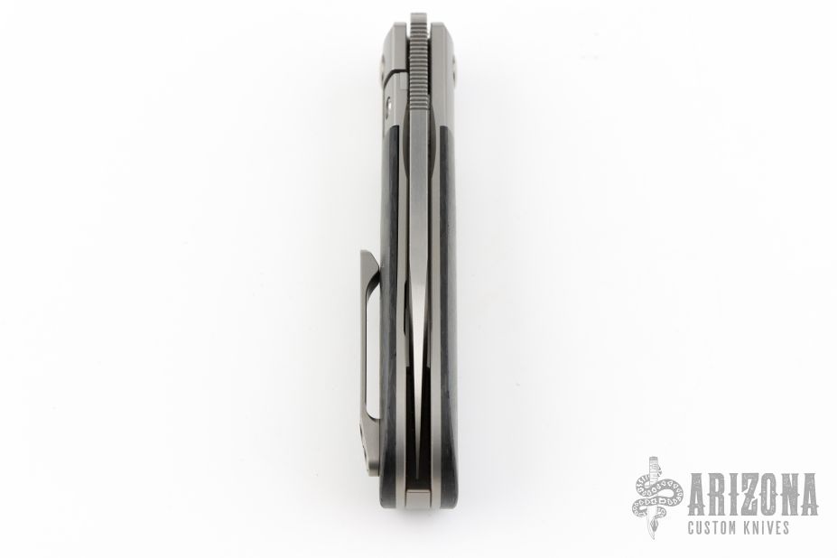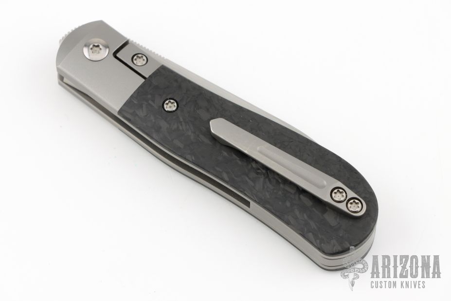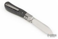 This Dogleg Front Flipper by Enrique Pena features a satin finished blade with a front flipper and notched thumbrest. The handle has titanium bolsters, marbled carbon fiber scales with a titanium backspacer and matching tip up pocket clip. Includes a Pena X-Series padded box. Excellent Condition.