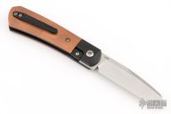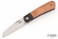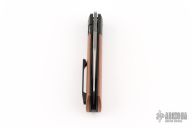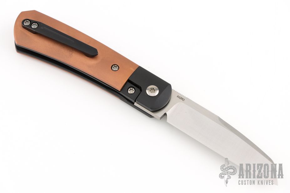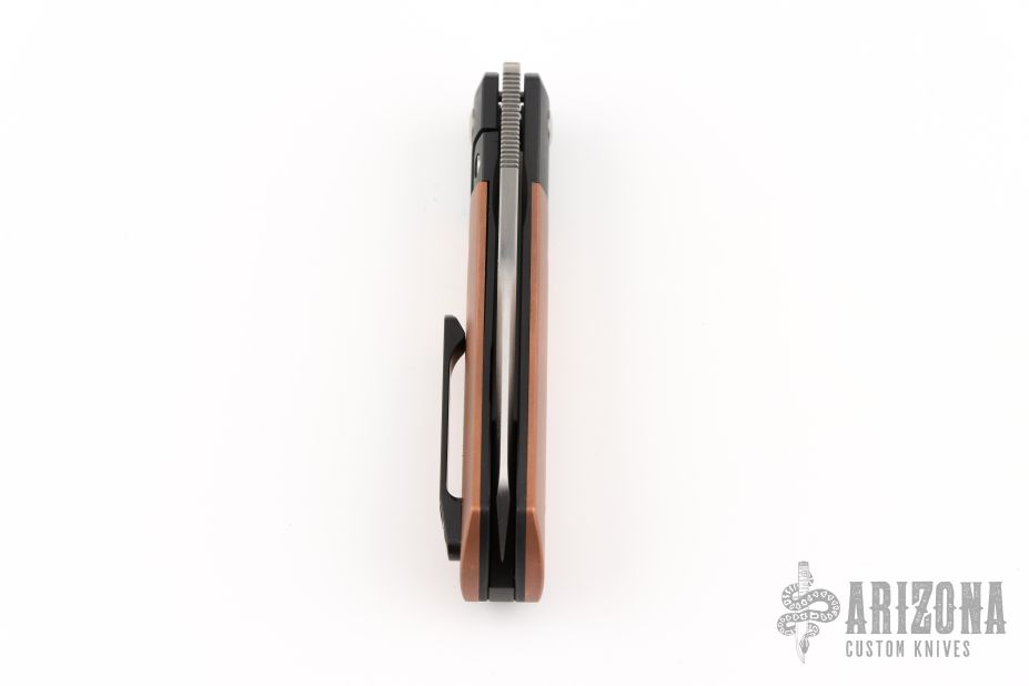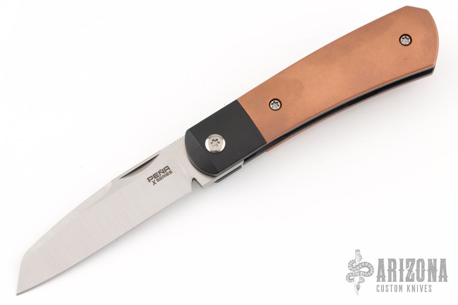 This Apache Front Flipper by Enrique Pena features a satin finished blade with a front flipper and notched thumbrest. The handle has black titanium bolsters, copper scales with a titanium backspacer and matching tip up pocket clip. Includes a Pena X-Series padded box. Excellent Condition.