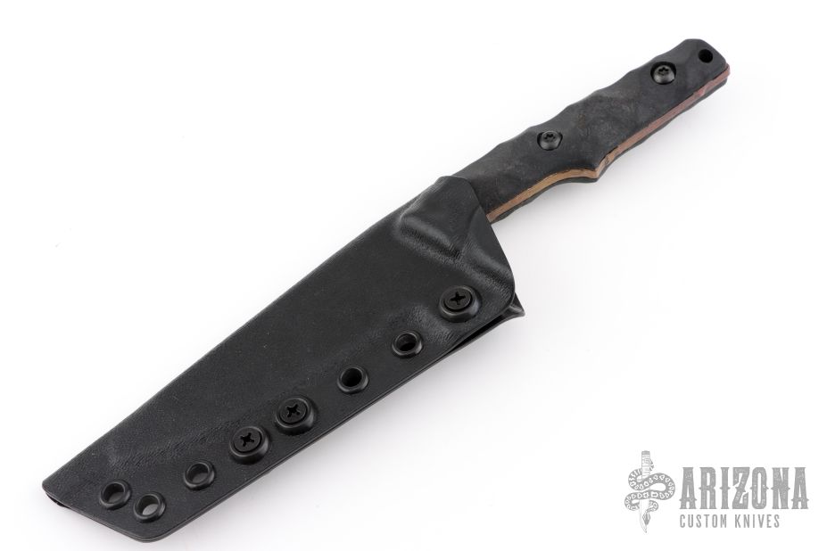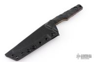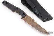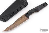 This EB-11  by Bawidamann Blades features an acid etch with bronze pearl patina finished blade with notched thumbrest, .148" blade stock and 1.191" blade depth, full tang construction. The handle has IM Bawidamann Chunked Pattern Carbon Fiber scales (proprietary Carbon fiber composite). Comes ready to carry with the Bawidamann Uberscabbard. New from maker.