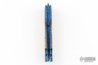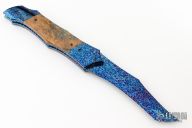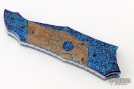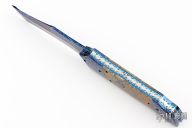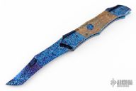 This Predator Auto by Kyle Vallotton features a blued Bertie Rietveld "Nebula" Damascus blade with false top edge. The handle has matching Damascus bolsters and push button, mammoth molar scales, anodized and fileworked titanium liners, and fileworked stainless steel backspacer. Nice lockup, action and blade seating. Comes with zippered case and COA. Excellent condition.