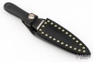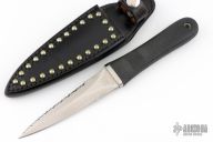 "Originally designed as back-up for law enforcement and military personnel, the Pentagon series is now popular with outdoor knife enthusiasts as well. The Pentagon offers the instant choice between a serrated or beveled edge for cutting options. Twin thumb notches enable accurate blade orientation and downward control. The aggressively checkered, flared handles provide confident gripping as well as sensational feel and balance." Comes with a Kenny Rowe riveted black leather sheath and zipper case. Has a couple very light scratches, otherwise excellent condition.