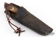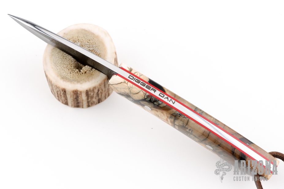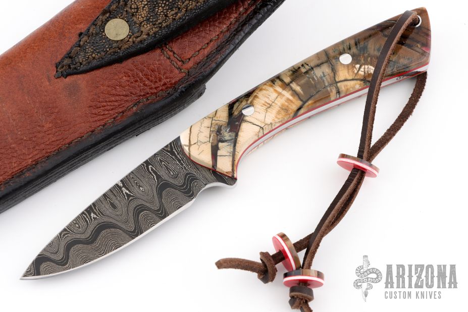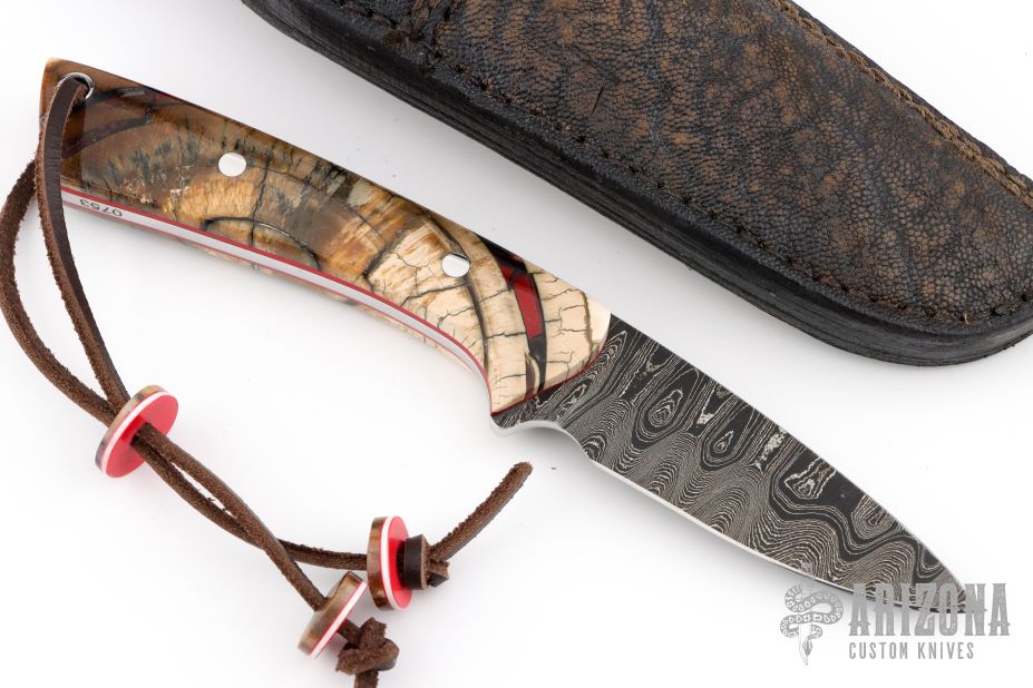 This Hunter by Digger Dan features a Damascus (416 layer 5160/15N20/Nickel) blade with a full tang construction.  .138" Blade Stock.  .994" Blade Depth.  The handle features stabilized mammoth scales with clear resin, red liners.  Includes a brown leather sheath with elephant hide overlay, and original box. Has mammoth ivory beads with red/white liners. New from maker!