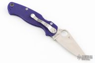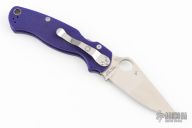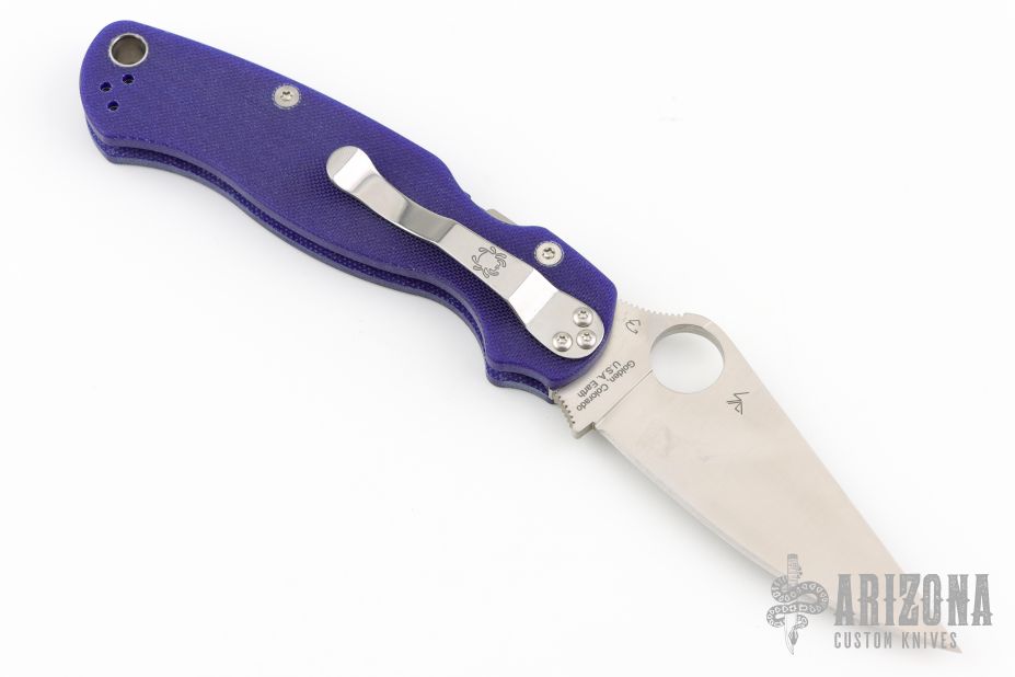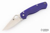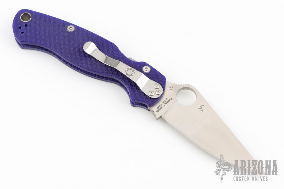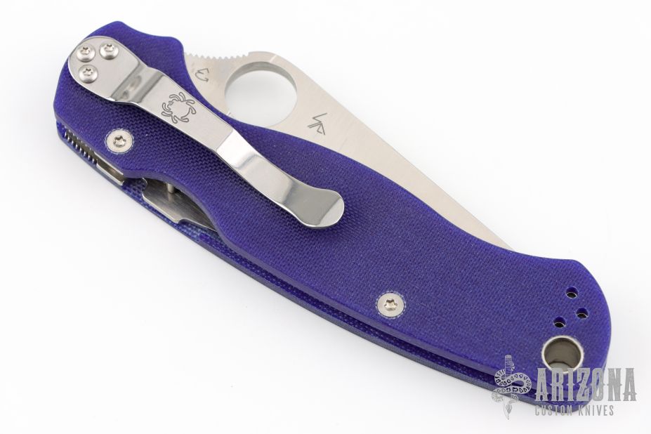 This Paramilitary 2 from Spyderco has a satin finished clip point blade with thumbhole and notched thumb rest. Handle is blue G10 with stainless steel liners and stainless steel 4-way reversible clip. Comes with original box and papers. Has a couple light scuffs, excellent condition otherwise.
