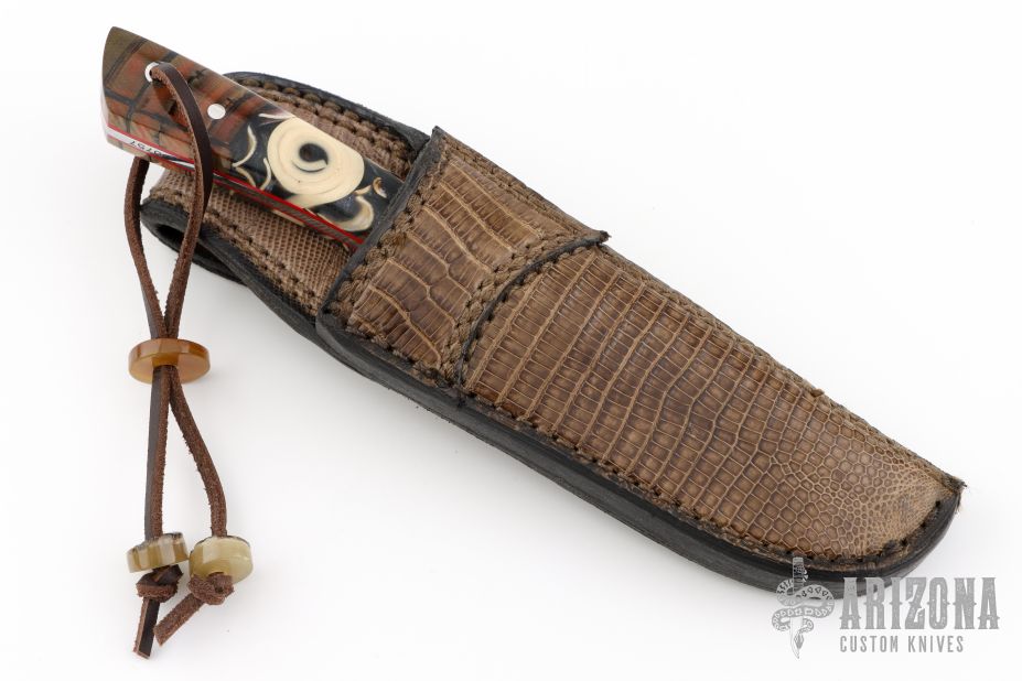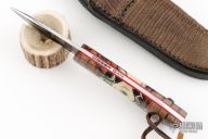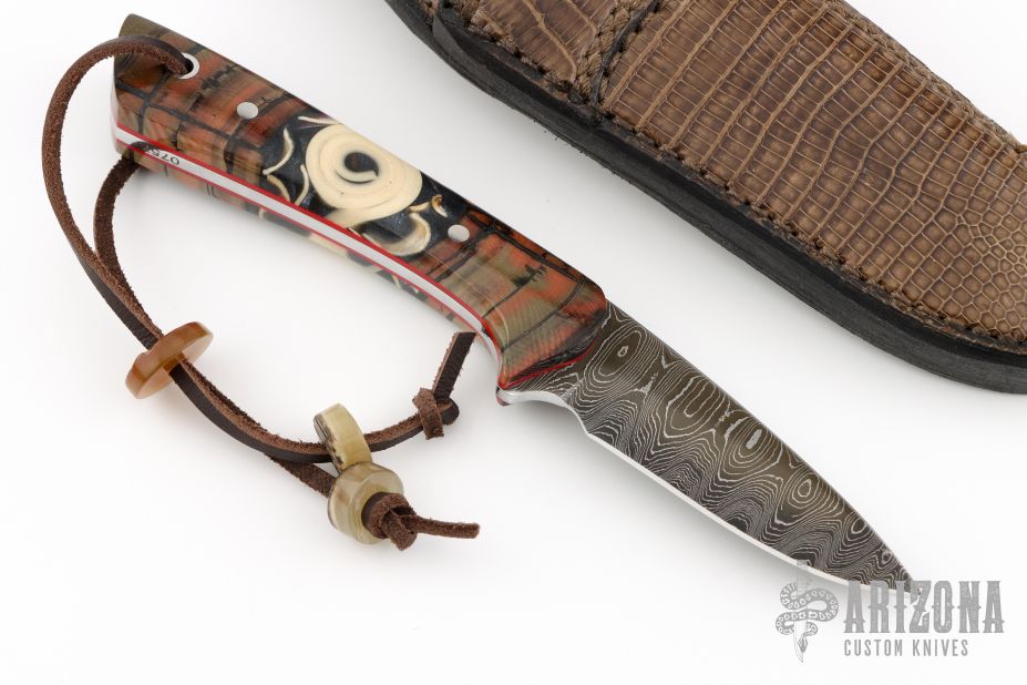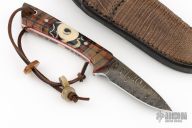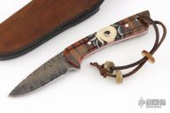 This Hunter by Digger Dan features a Damascus (416 layer 5160/15N20/Nickel) blade with a full tang construction.  .137" Blade Stock.  .992" Blade Depth.  The handle features stabilized mammoth scales with circular inlay and pistachio shell inlays, red liners.  Includes a brown leather sheath with iguana skin overlay, and original box. Has musk ox beads. New from maker!