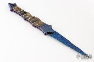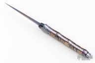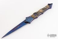 This Saber side-opening automatic by Rainy Vallotton features a blued Damascus blade with false top edge. The handle has matching Damascus double bolsters, mammoth ivory scales, and Damascus push button. File work on SS backspacer and all around the anodized titanium liners. Strong and fast leaf spring action. Nice function. Beautiful materials. Excellent work. Includes original maker's clamshell box. Excellent condition.