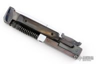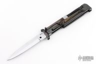 This AK-47 Auto by Agasi Hambartsumian of Armenian Doctor Knives features a mirror polished blade. The handle has a blued steel frame and swing guards, buffalo horn scales with black hardware. New from maker. Fires very strong. Has an interesting mechanism. The spring on the spine of the handle is compressed when the blade is closed, and gives the spring extra power when fired.