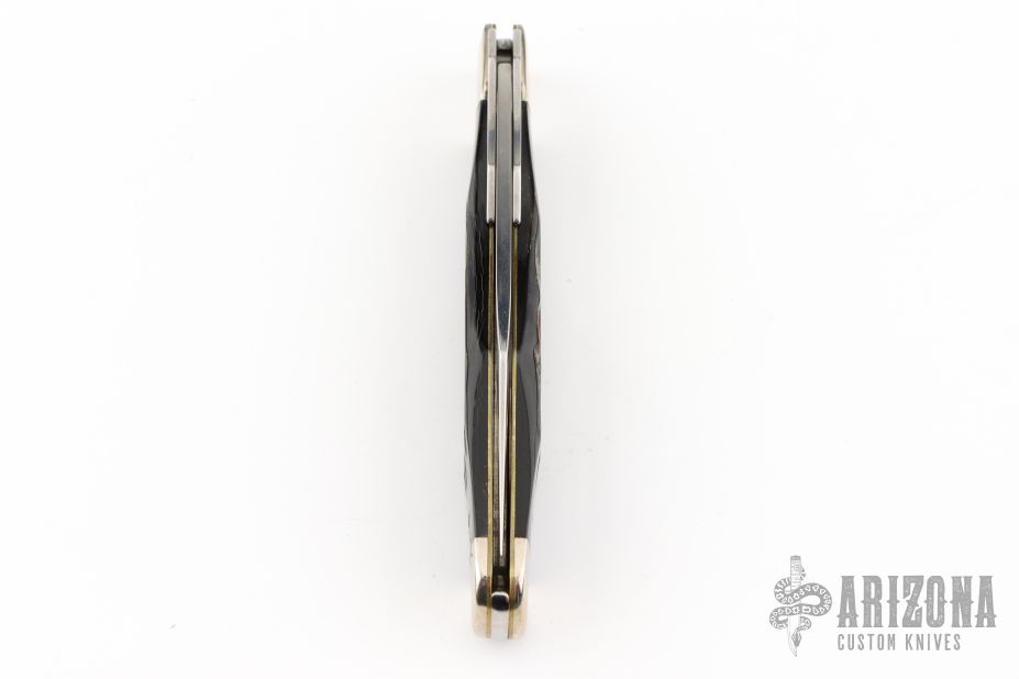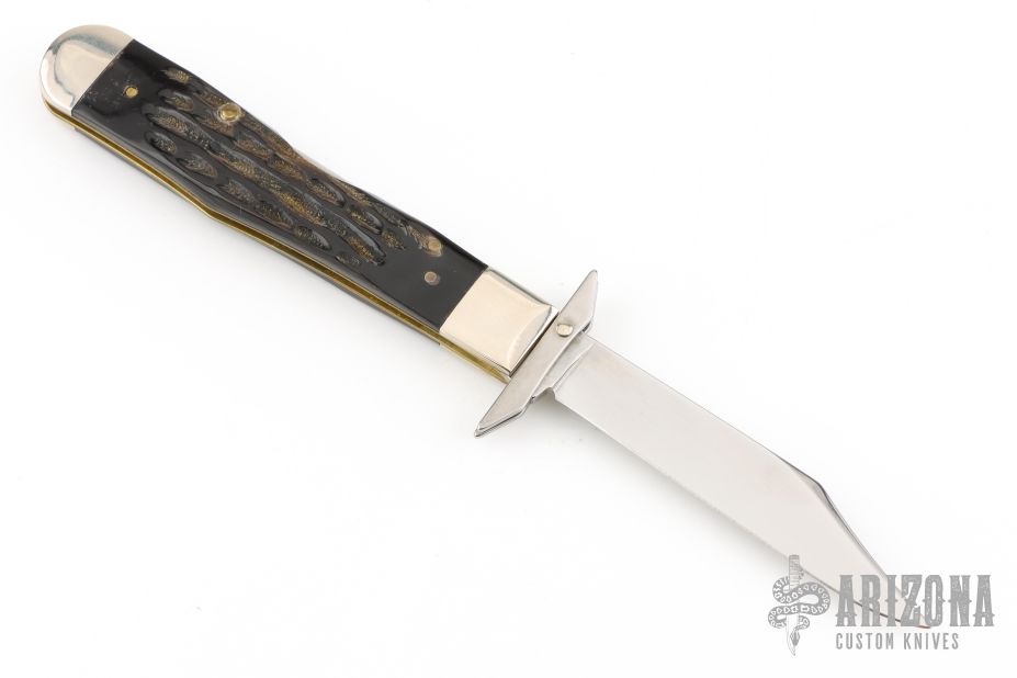 This Cheetah lock back folder from Case Knives features a clip point mirror polished blade with nail nick. The handle has nickel silver bolsters, front and rear, and steel swing guard, and the scales are jigged buffalo horn over brass liners. Comes with original box and papers. Excellent condition.