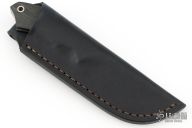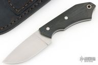 This Drop Point by Ray Laconico features a drop point hand rub satin finished blade with visible temper line, .125" blade stock and 1.075" blade depth. The handle has black linen micarta scales with stainless pins and lanyard tube over full tang construction. Excellent condition. Comes with a black leather sheath and a zippered case.