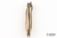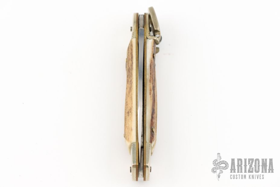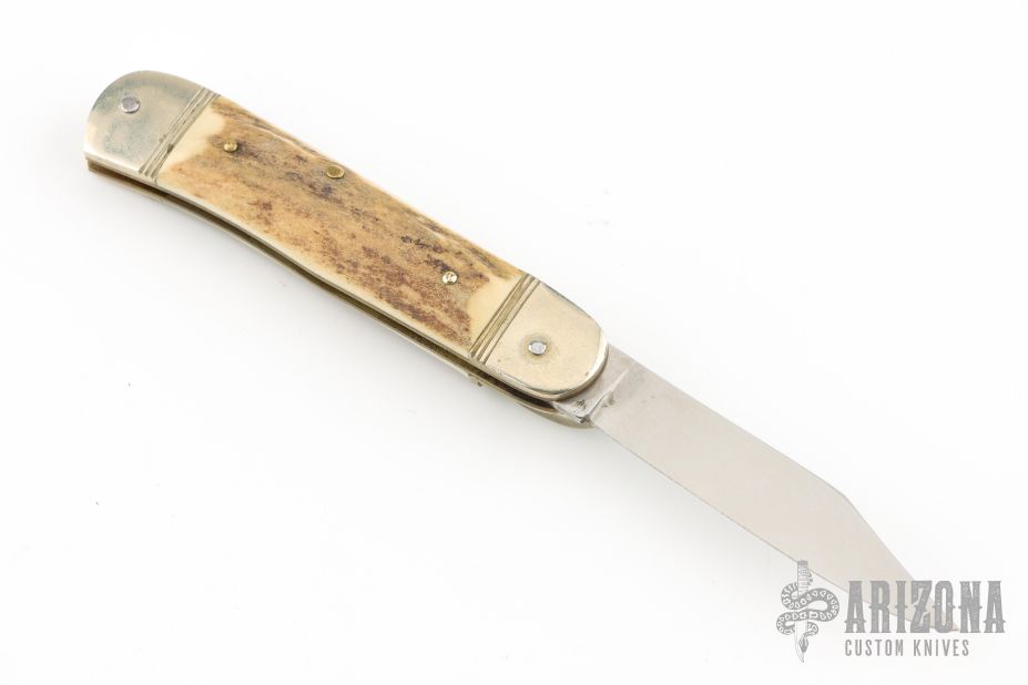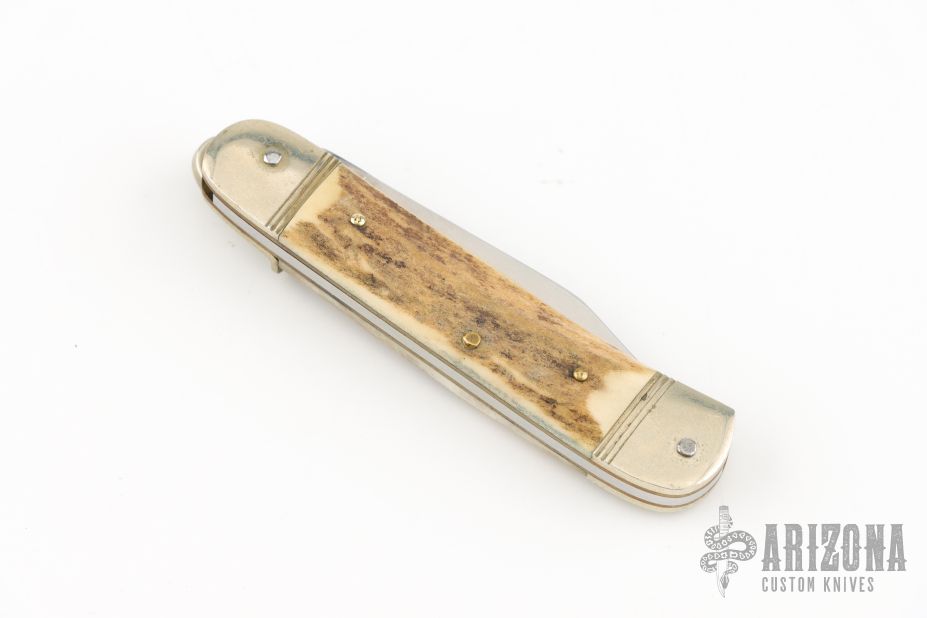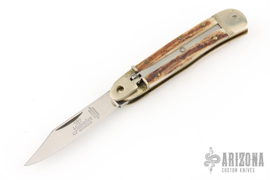This leverlock auto by Hubertus features a mirror polished blade, nickel silver double bolsters, stag scales, nickel silver liners and brass pins. Opens with a nice snap. Very fast opening. Has some light scratches and patina, otherwise excellent condition.