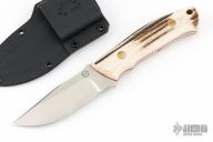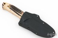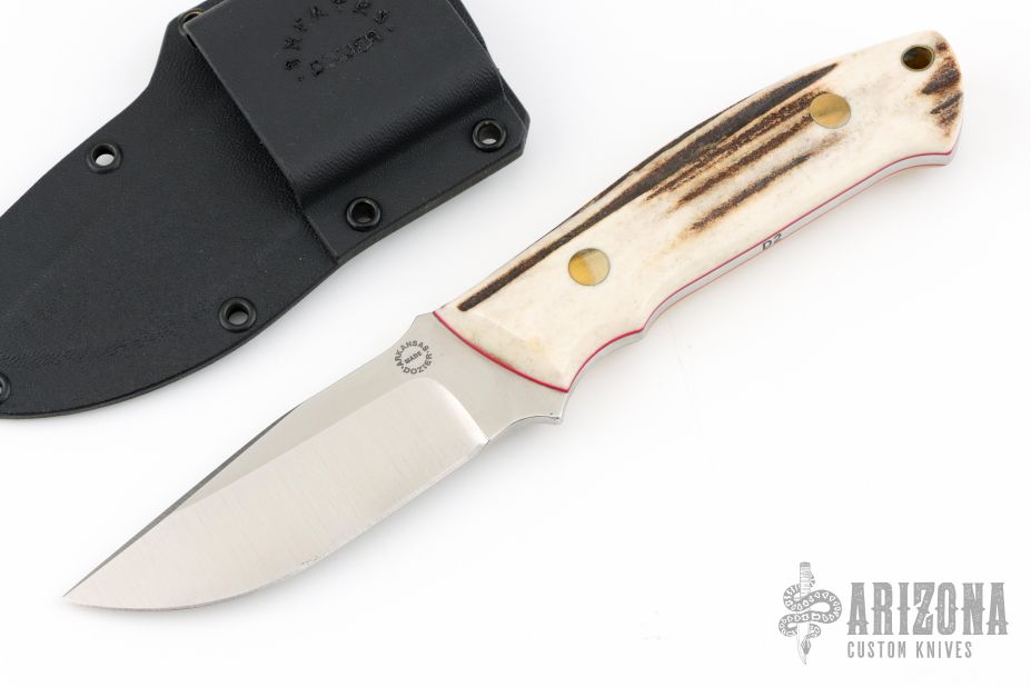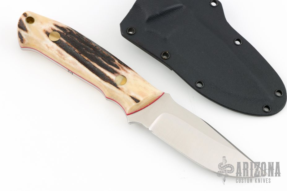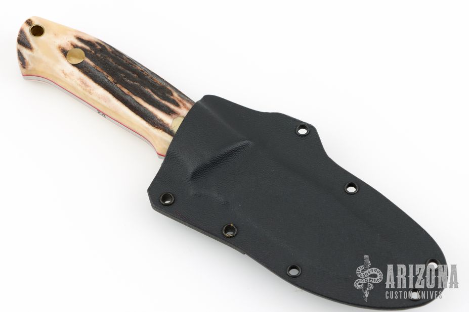 This Custom Hunter by Dozier Knives features a satin finished blade with false top edge, .132" blade stock and 1.150" blade depth, full tang construction. The handle has stag scales with red liners and brass pins and lanyard hole. Includes kydex sheath. Excellent condition.