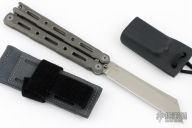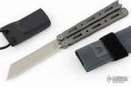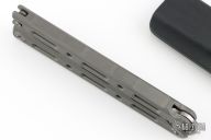 This Model 87 Balisong by Benchmade features a tumble finished wharncliffe style blade. The handle has an integrally constructed, skeletonized titanium frame with bead blast finish. Spring-loaded T latch on pommel. Comes with original box, sheath and papers. Has some light scuffs, otherwise excellent condition. Comes with a custom kydex sheath as well.