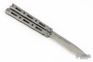 This Model 85 Balisong by Benchmade features a tumble finished blade. The handle has an integrally constructed, skeletonized titanium frame with bead blast finish. Spring-loaded T latch on pommel. Comes with original box, papers and slip sheath. Comes with a custom kydex sheath. Has a couple light scuffs, otherwise excellent condition.