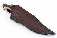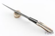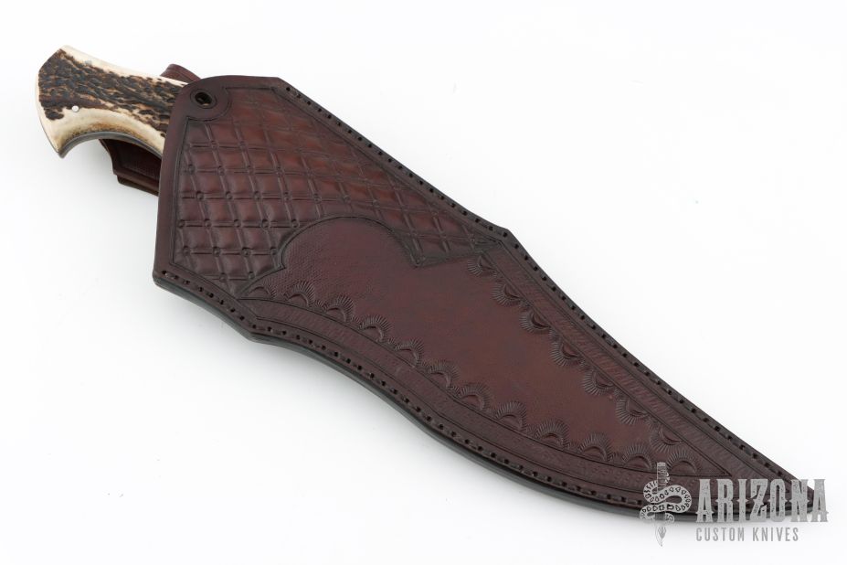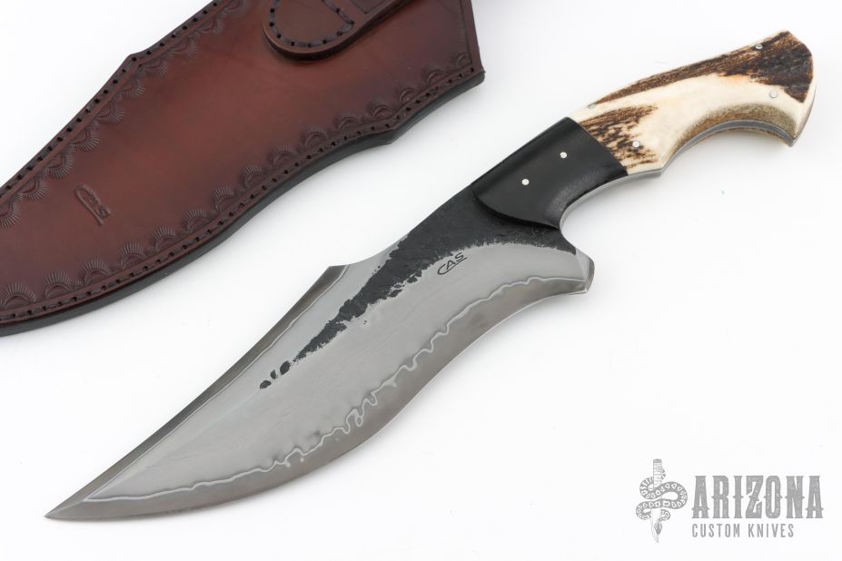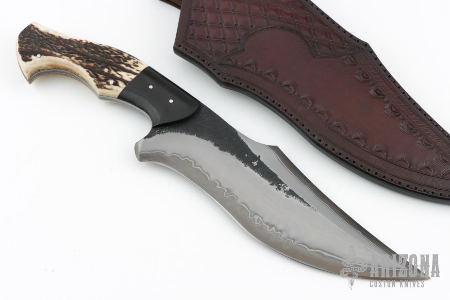 This Black Bear by Sobral brothers features a forged San Mai blade with hammer marked flats and false top edge, .264" blade stock and 2.142" blade depth, full tang construction. The handle has black canvas micarta bolsters, stag scales with stainless steel pins. Comes with a beautiful hand tooled black/brown leather sheath and a nylon zippered case. Excellent condition!