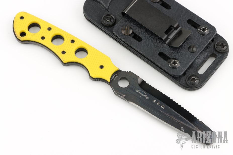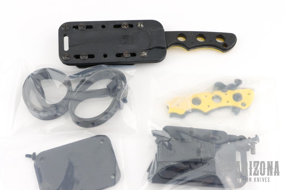 The Zytel sheath with dual attachment panels and black stainless spring steel clip allows eight carry modes and countless variations. Black finish brass Chicago screws allow adjustment of the knife compression fit into the sheath. Equally important, they are used for a multitude of attachment orientations: on diving buoyancy compensators and pocket flaps, webbing, with dive leg straps, on PFDs, or with a neck cord.