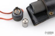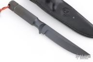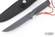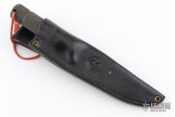 "Exceptionally practical knives, suitable for backpacking, hiking or camping. The high grind and single cross guard offer a sleek blade for food preparation in camp, a sharp point for opening cans and a sturdy tool for whittling." 3/16" blade thickness and 7/8" blade depth. False top edge. Notched thumbrest. Butt cap unscrews allowing access to the inside of the hollow handle. Includes original sheath. Has some light scuffs and scratches, otherwise good condition. Inside the handle is an added compass and a survival lighter.
