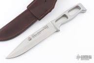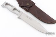 This German Expedition Knife features a satin finished clip point blade, .225" blade stock and 1.399" blade depth at the ricasso, integral construction. The handle is satin finished stainless steel. Comes with a brown leather sheath. Comes with original box and papers. Excellent condition.