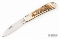 This knife is a Collaboration between Case and Tony Bose, it features a mirror finished drop point blade with nail nick. The handle has nickel silver bolsters and escutcheon, jigged bone covers, stainless steel spring, brass liners and pins. Comes with original box and papers. Has some patina, otherwise Excellent condition.