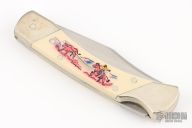 This cowboy lockback by Schrade features a satin finished blade with a single nail nick. The handle has nickel silver bolsters, scrimshaw finished paper micarta covers, brass liners and stainless steel spring. Comes with original box, sheath, and papers. Has some patina, and light scuffs, Excellent condition otherwise. #3203