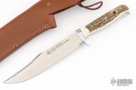 This Original Bowie by Puma features a satin finished blade with false top edge, .147" blade stock and 1.115" blade depth, full tang construction. The handle has an aluminum guard, stag scales and a lanyard hole at the butt. Comes with original brown leather sheath. Has a couple light scuffs and scratches, otherwise excellent condition. #57102 on hilt.